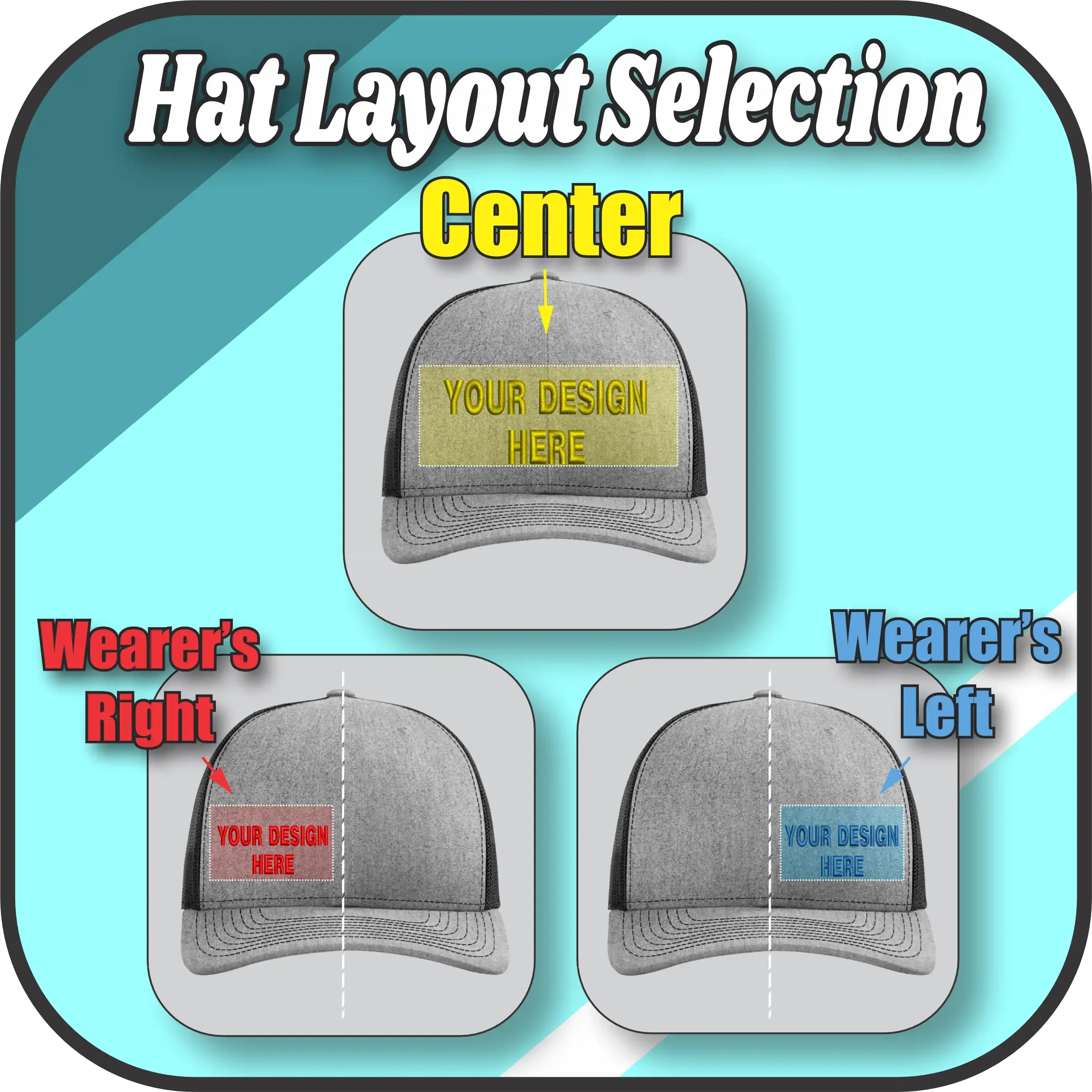 Stamped design upgrade: + $15 one-time stamp creation fee (per design) and + $2.50 per hat (stamped patches)Reorders: no setup fee again unless the design changes. (Stamp creation fee only applies the first time a new stamped design is made.)
